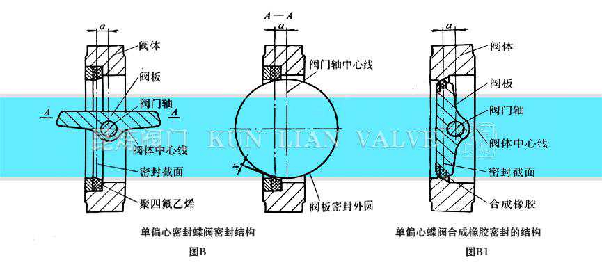 单偏心密封蝶阀的密封原理图B所示为一种典型的单偏心密封蝶阀密封结构: