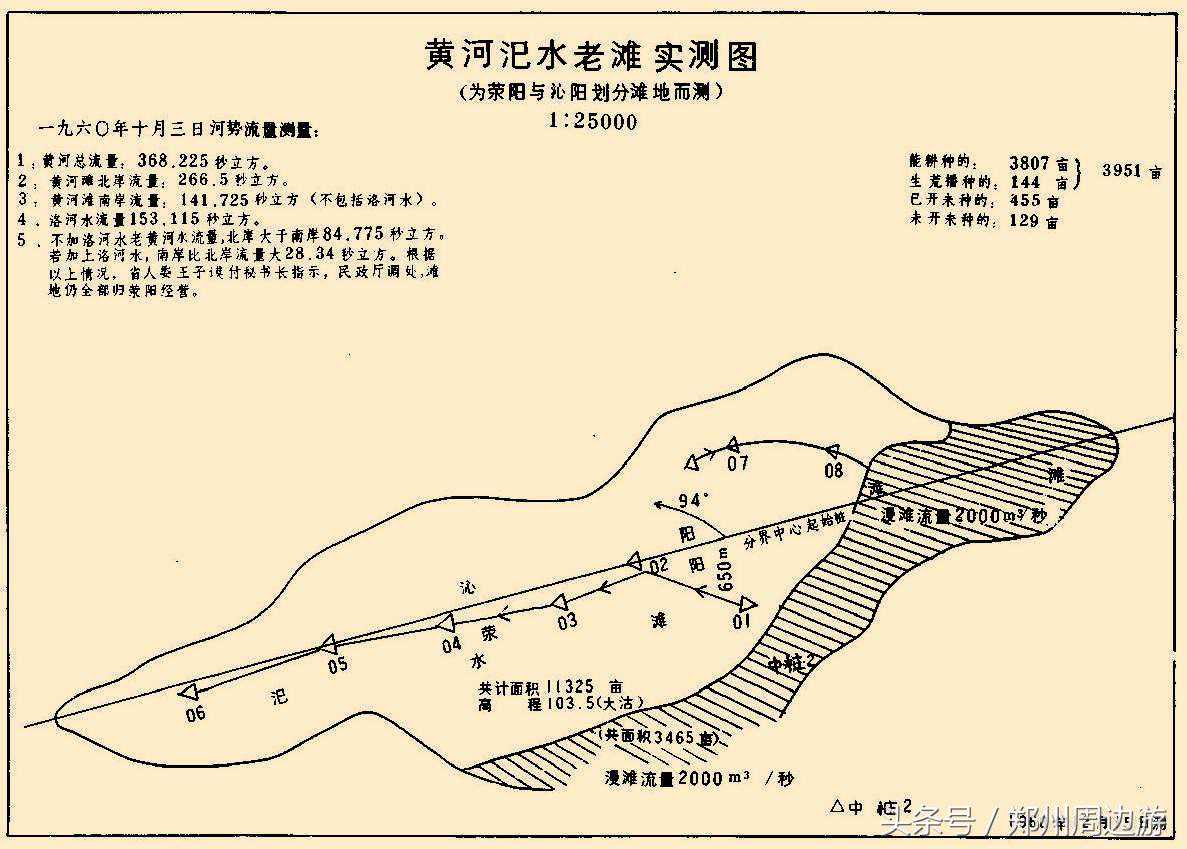 黄河自太行、邙山峡谷流人平原地区后,由于河道宽扩,河床高浅,河水扩散,流势缓乱,因而泥沙沉甸,形成夹河滩地。汜水滩(即荥、沁两县间之夹河滩,因靠近荥阳县汜水口,故两岸群众称之为汜水滩)年代已久,据群众传说,已是三百年老滩。据我们勘测可耕面积(即老滩部分)约50000余亩。土壤土质肥沃,遍生野黑豆(粮食)及杂草、芦山草等,自然资源丰富,地势高亢,约海拔104公尺,黄河洪峰流量在20000m3/秒以下,不会漫滩。三门峡水坝建成后,汜水滩被洪水淹没机会大大减少。但据桃花峪水库初步设计,库区水位达113公尺。故该滩于桃花峪水库建成后,即行沦没,据我们于12、13日勘测:裴峪段黄河总流量823m3/秒。至裴峪口东,河水分为三股。南股流量为504m3/秒,古总流量的61%;北两股自大王庙合流,流量为319m3/秒,占总流量的3g%。在大王庙东,洛河有45m3/秒流量注入南股。到汜水滩段水面宽315公尺,平均水深1.58公尺,流量为519m3/秒,占总流量的62.8%。北股水面宽800公尺;平均水深072公尺;流量为306m3/秒,占总流量的37.2%。依此次勘测及黄委会历年勘测资料记录及分析结果,因裴峪口西邙山有弯弧,加之该段河床南侧较高于北侧,形成黄河流势的规律是:大水走北、小水走南(即船工所谓:大水就势,小水归槽)。汜水滩两侧的河道特征是:南侧水面窄,水量集中,流速大;北侧水面宽,河道浅、宽、乱,经常有三股河道,游荡性大,水量分散,流速小。据资料分析,这种规律和特征,不经人工治理,是不易改变的。