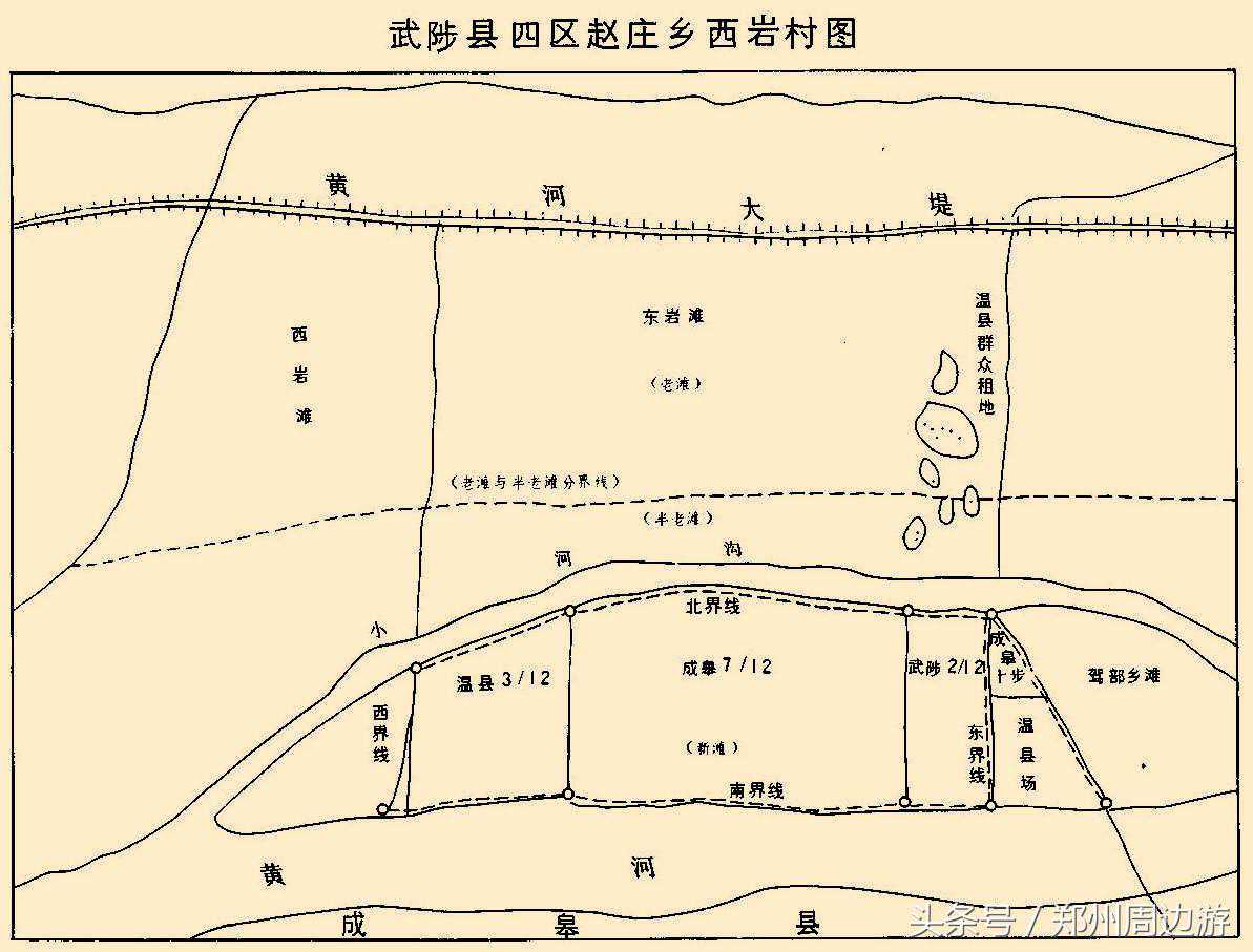 四、温、武、成新夹河滩划界始末(《温县志》材料)1953年秋,温县东滩同武陟、成皋三县交界处,武陟县四区赵庄乡西岩村东,驾部乡西之东岩滩地,南界为黄河北岸,北界为黄河大堤之范围内,界线不明,发生纠纷。初经三县县、区、乡干部及群众代表商议,未获解决。