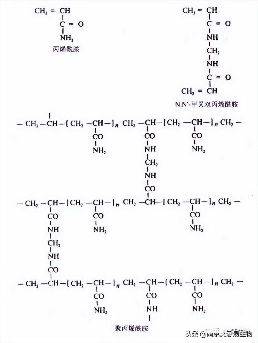 聚丙烯酰胺凝胶(polyacrylamidegel,PAG)是由单体丙烯酰胺(acrylamide,简称Acr)和交联剂N,N'-甲叉双丙烯酰胺(N,N'-methylenebisacrylamide)在催化剂和加速剂作用下聚合交联而成的三维网状结构的凝胶。一般用于蛋白质电泳的凝胶选用29:1的丙烯酰胺与N,N'-甲叉双丙烯酰胺的混合物,以过硫酸铵作为引发剂进行聚合。