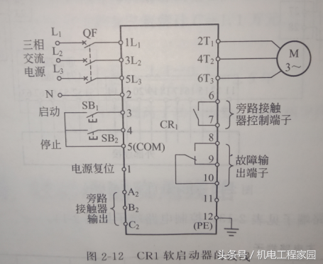 停机时,按下软停SB2,中间继电器KA失电释放,其常开触点断开,常闭触点闭合,端子STOP与COM接通,同时软起内部触点S断开,继电器JC失电释放,其常开触点断开,旁路接触器KM失电释放,主触头断开,电动机通过软启动器软停车,同时停止指示灯HR点亮。
