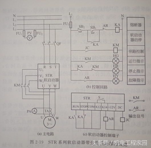 当软起发生故障或电机过载,软起内部触点S闭合,经故障输出端子K14使继电器AR得到12V电源吸合,继电器AR的常闭触点断开,中间继电器KA失电释放,KM失电释放,电动机通过软启软停车,旁路也可以通过AR的输出信号触点,先使断路器QF跳转,再使电动机停车,同时故障指示灯HY点亮
