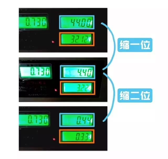 标价22元/500克的猪肉,在“单价栏”输入的是44.00元/千克,假如称出是0.730千克,金额应是32.12元。如果在“单价栏”输入时缩一位即4.40,电子秤则显示为3.22元,商家就会收取消费者32.2元;若输入时缩二位即0.44,则显示为0.33元,商家就会收取消费者33元。