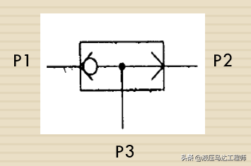 单向阀的符号也很简单,中间的圆圈代表单向阀中的钢球,下面的V字形代表阀密封面,钢球和V形密封面共同作用形成了单向阀。