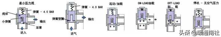 温控阀作用:使压缩机在刚启动时冷却剂绕过油冷却器,使温度很快上升,从而避免压缩机系统内部产生水汽;通过温控元件的开启度,控制冷热冷却剂的混和量,使压缩机的喷油温度控制在最佳点。