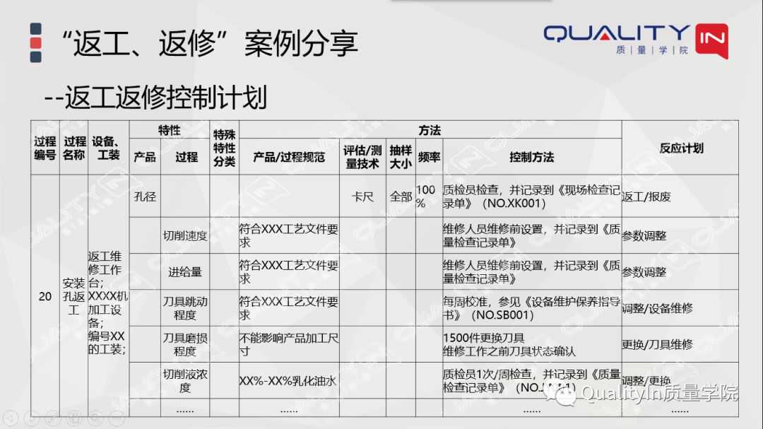 那么根据返工、返修FMEA转成控制计划就相对简单了。那么我们在这里也不给大家进行详述,大家可以参考我之前的分享,里面讲到了FMEA和控制计划的对应关系,我们可以利用这样的一个对应关系,转成控制计划。那么控制计划里,对于返工、返修的控制计划里,重点要去确认好、要去制定好它,再次确认方法和频率,还有样本的大小。