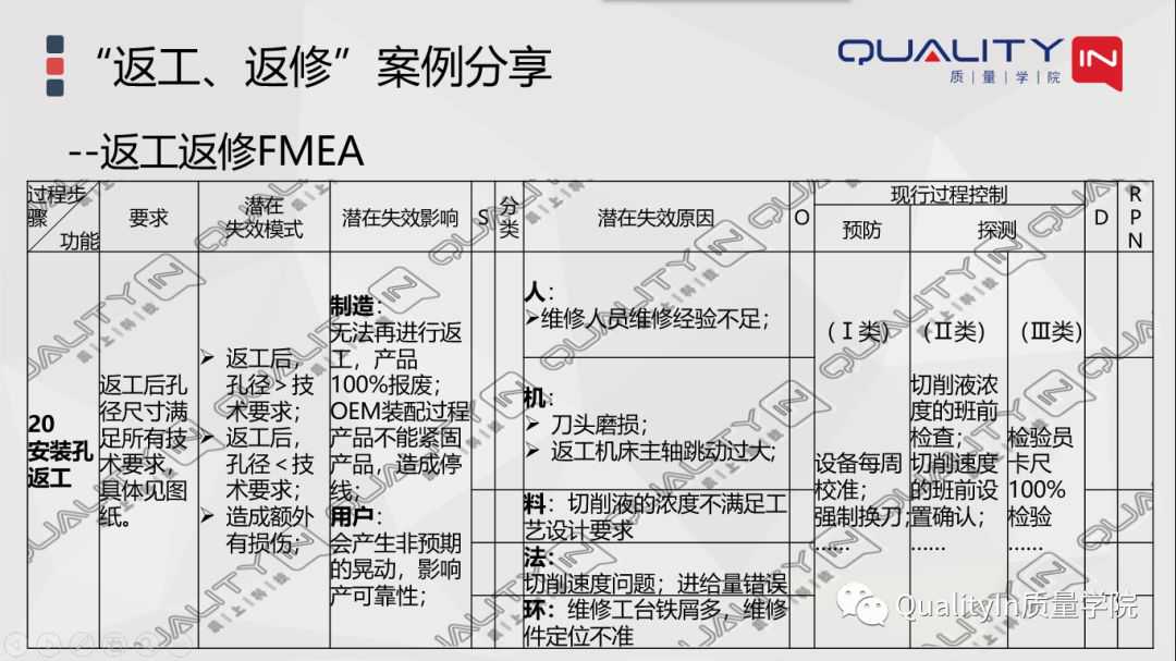 比如说我们对孔径进行再次加工,那么加工以后我们用什么方法来检验,谁来进行检验,都应该在控制计划里给它体现清楚了。那么对于失效原因的一些检查、一些控制手段,我们可以体现到控制计划里的控制方法里,也可以体现到控制计划里的前面的评估技术、抽样大小、频率里。这个就是按照我们FMEA和控制计划的一个对应关系,进行一个合理的转化就可以了。关键是把返工、返修的FMEA要做好、做完善