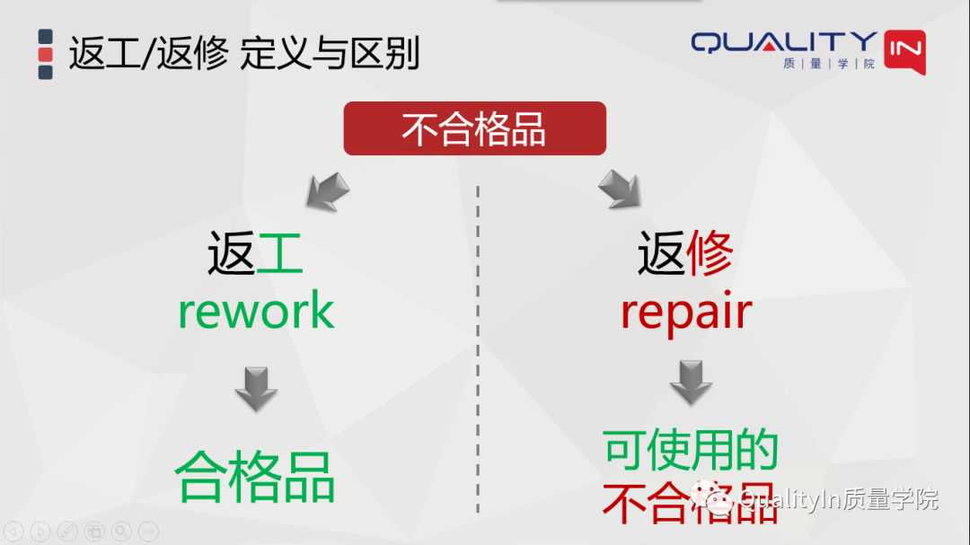首先我们要非常清楚,返工、返修的定义和区别联系是什么?我们来看这页PPT,我用一张这样的简图,清楚地给大家呈现出来返工、返修它们的联系和区别。