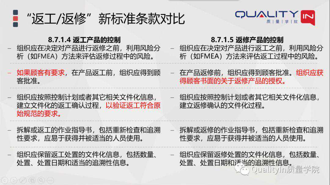 所以总结一下,标准中对于返工、返修提出了这样五个方面的要求。