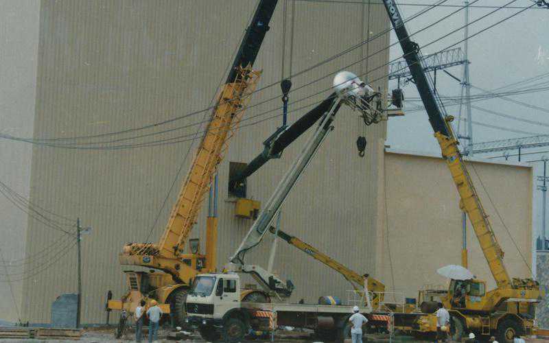 80年代末,湖北送变电公司参建葛洲坝换流站时,进行直流穿墙套管安装作业。湖北送变电公司供图