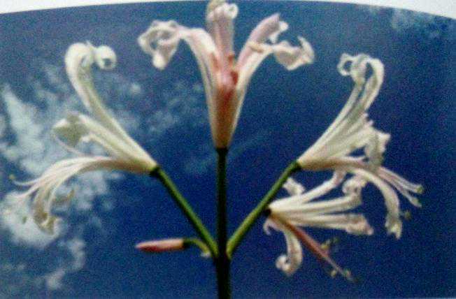 原产南非的尼润石蒜,花瓣上带有金属的光泽,当太阳照射时会闪闪发光,所以又有钻石百合或钻石水晶的俗名。花茎顶端着生4-8朵花,花瓣会反卷,花瓣边缘有波浪状的皱褶,品种繁多,花色艳丽。花期秋季,大部分维持着见花不见叶的特性,只有少部分品种可花叶并存,为目前台湾较少见的石蒜。