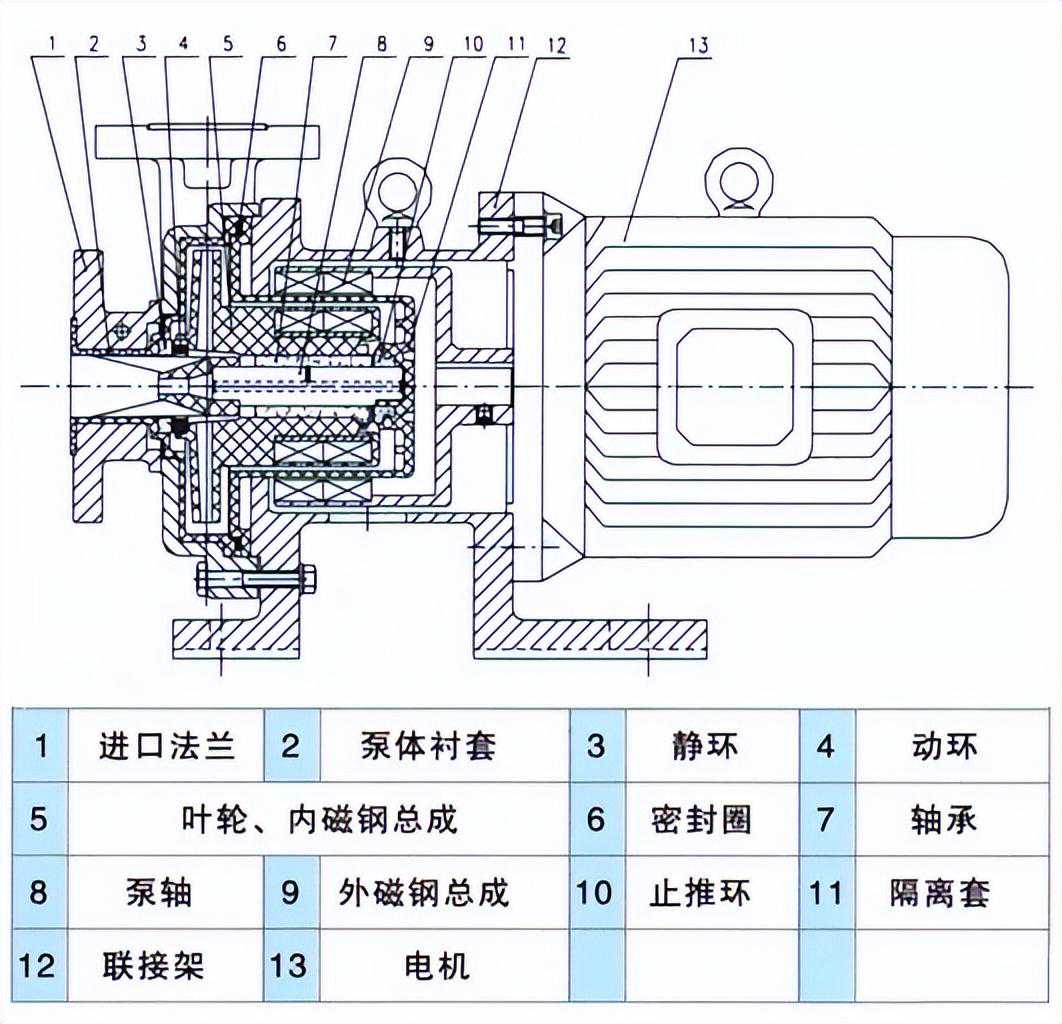 而我们从上图中可以得知,氟塑料磁力泵主要是由1、进口法兰2、泵体衬套3、静环4、动环5、叶轮、内磁钢总成6、密封圈7、轴承8、泵轴9、外磁钢总成10、止推环11、隔离套12、联接架13、电机等组成。