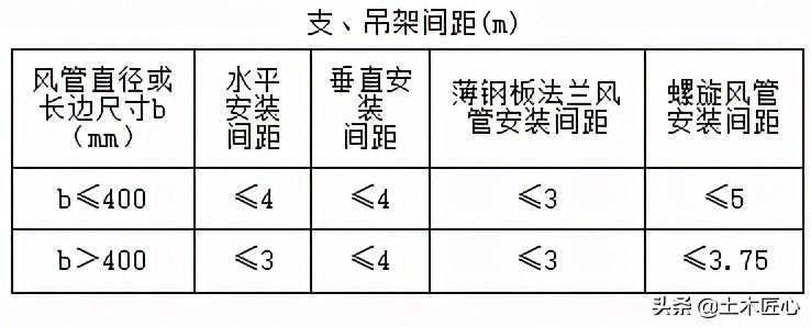 (3)风管支、吊架的间距当设计无特殊要求时,应符合下表规定;风管垂直安装,单根直管至少应有2个固定点。