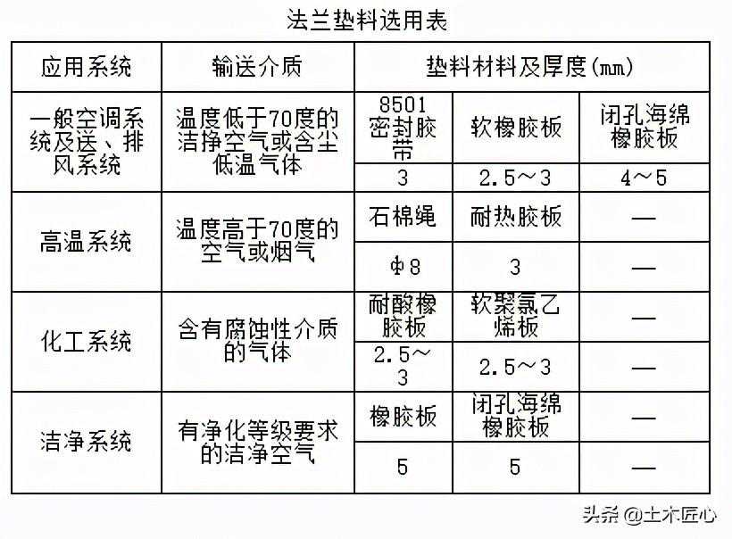 3采用法兰连接的风管,垫料不得突入管内。法兰垫料如设计无明确规定时,可按下表选用。