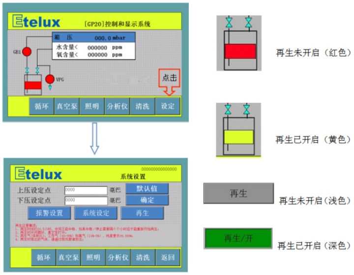饱和后吸附水氧能力下降,导致不能达到要求此时就需要对净化柱进行再生还原恢复净化材料吸附能力再生前需要满足下面条件:—需要再生的净化柱已停止循环;—开启真空泵;—确认是否需要输入密码;-箱体压力设定为“默认值”—箱体内水、氧含量<200ppm。