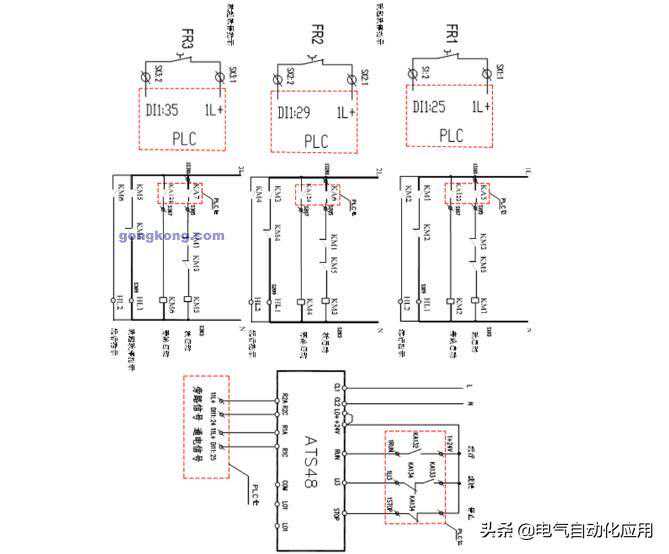 该项目是某某水处理系统,该系统中有九台55KW电机,选用施耐德ATS48C11Q(55KW)软启动器。采用一拖三级联控制方式,利用西门子S7-300PLC进行集中控制,从而实现水泵的任意软启和软停。在该系统中所有的选择、起停和故障信号均进入PLC输入端由内部程序进行处理和监控,所有接触器动作均由PLC的继电器输出进行控制,软启动器的运行信号(RUN),停止信号(STOP)和级联信号(LIX),也由PLC的继电器输出进行控制。要使该软启动器实现一拖三的级联控制,必须把ATS48的输出继电器R1设置为“r1i(隔离继电器)”把逻辑输入LI3设置为“LIC(级联控制)”,把CSC参数设置为“ON(级联功能激活)”控制原理图中(图1、图2)描述了ATS48一拖三任意软起软停的原理。