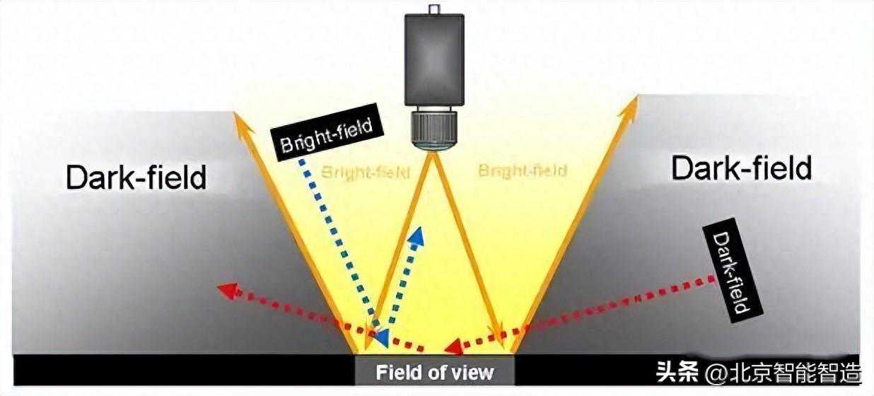 反射光与光源角度相同。明场:光线反射后进入照相机。暗场:光线反射后未进入照相机。