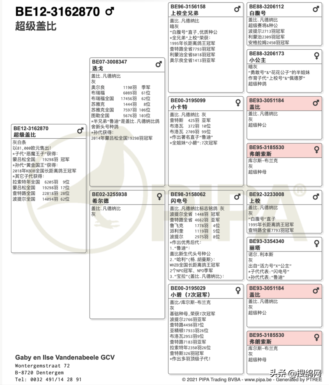 还有比利时为伯特.凡登伯格用盖比血系飞出“葛洛丽娅”2013年KBDB全国长距离鸽王亚军和““葛洛丽娅公主”2014年盖雷全国一岁鸽17430羽冠军!.