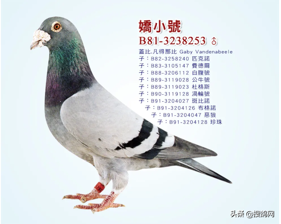 由于“娇小号”配不同雌鸽都作育优秀的子代群,盖比再加入其他顶尖的品系混血使翔,然后再用“娇小号”的同父半兄妹子孙后代融合在一起,既保证了品系的特质又让外血巧妙的加入提升自己的鸽系,这样以来,盖比的王朝在后期保持的既完整又能飞善育。“娇小号”让世界鸽友耳熟能详的代表子代,当之无愧是“白腹号”。“白腹号”随着父亲的足迹,快速建立起自己的“白腹王朝”。